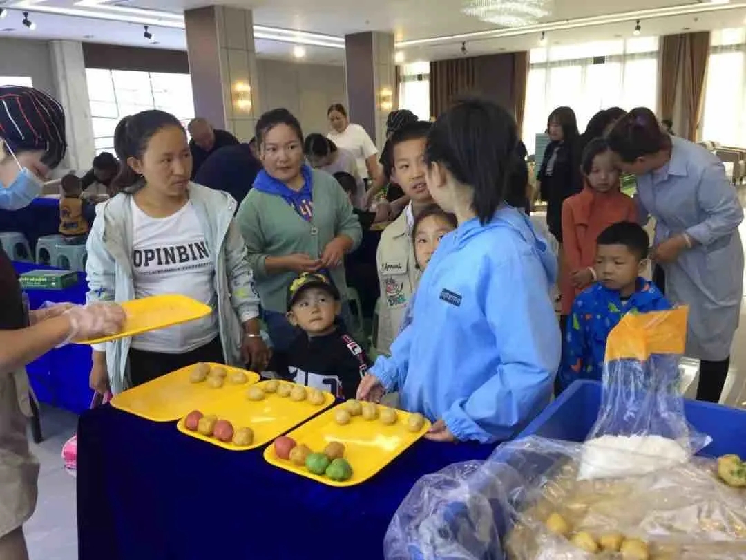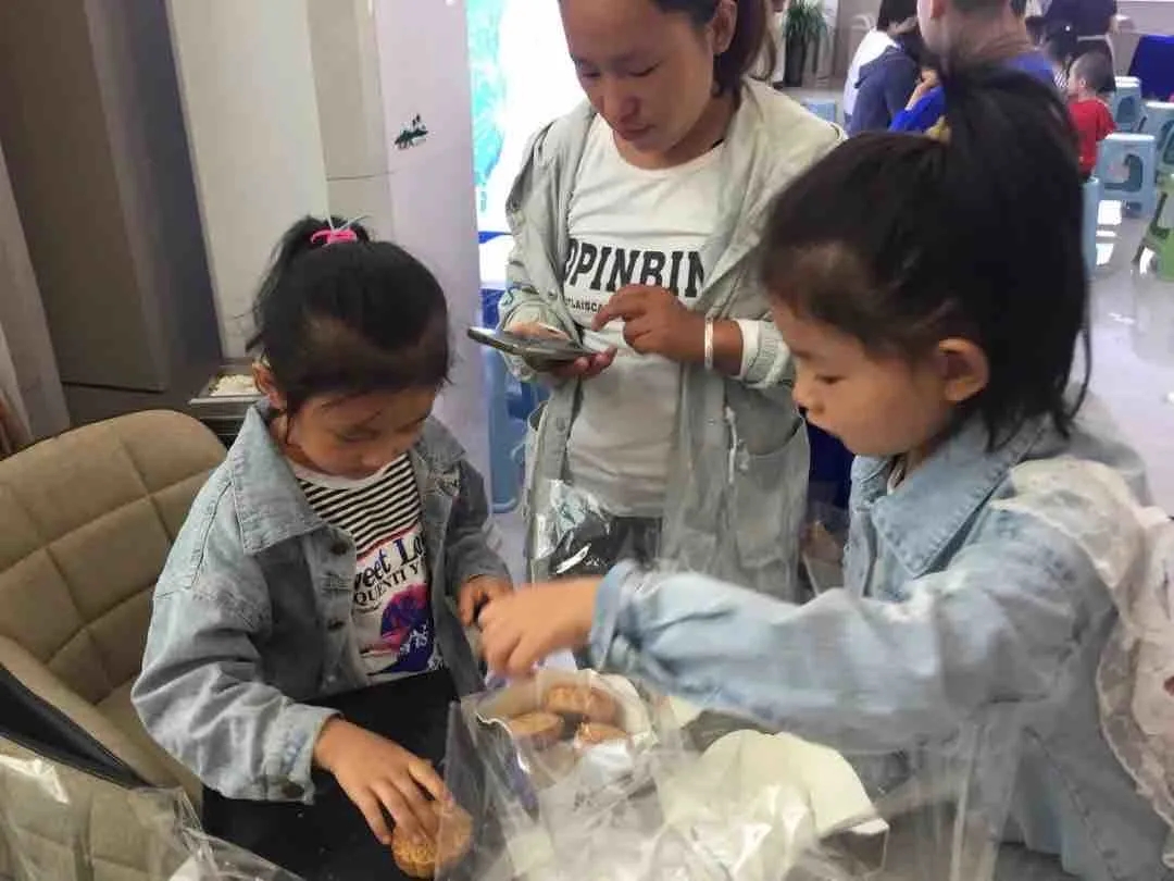 小朋友們排隊(duì)領(lǐng)取制作月餅的材料和模具