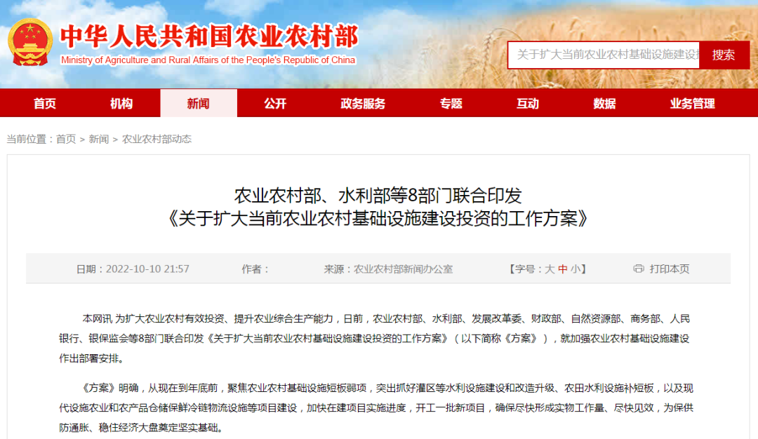據(jù)農(nóng)業(yè)農(nóng)村部網(wǎng)站10日消息, 為擴(kuò)大農(nóng)業(yè)農(nóng)村有效投資、提升農(nóng)業(yè)綜合生產(chǎn)能力,日前,農(nóng)業(yè)農(nóng)村部、水利部、發(fā)展改革委、財(cái)政部、自然資源部、商務(wù)部、人民銀行、銀保監(jiān)會(huì)等八部門(mén)聯(lián)合印發(fā)《關(guān)于擴(kuò)大當(dāng)前農(nóng)業(yè)農(nóng)村基礎(chǔ)設(shè)施建設(shè)投資的工作方案》(以下簡(jiǎn)稱(chēng)《方案》),就加強(qiáng)農(nóng)業(yè)農(nóng)村基礎(chǔ)設(shè)施建設(shè)作出部署安排。